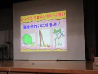 後半の活動では、野菜が体の中でどのような働きをするのか、また食べた野菜が体の中でどのように変化して栄養になるのかについて、スライドを見ながら話を聞きました。