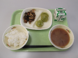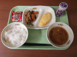 今日はチーズオムレツ、豚肉の黒酢炒め、つみれ汁、黒糖大豆です。