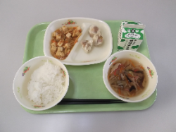 今日はコーンシュウマイ、麻婆豆腐、きのこスープです。