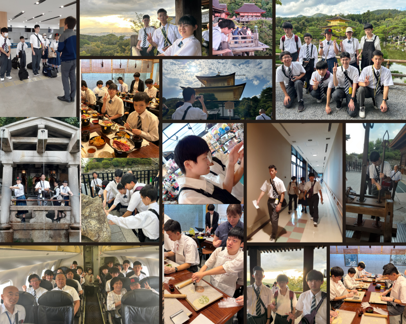 初めての飛行機という生徒もいて、機内はこれからの旅への期待からワクワクの生徒たちでした。1日目は京都観光です。八つ橋作り体験では、生地に3種類の味を混ぜ、麺棒で生地を丸くのばし、3種類の餡を入れて包みました。おいしい生八つ橋が完成しました。