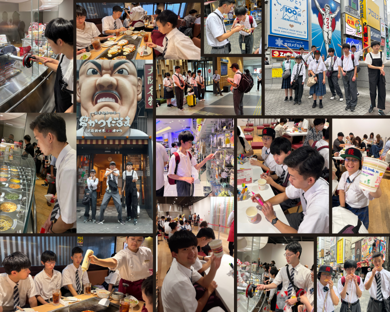 道頓堀自主研では、3チームに分かれ、「くいだおれ太郎と写真を撮る」や「10円パンを食べて1万円の顔をせよ」などのミッションに挑みました。地図やアプリで探し全チーム全9個のミッションを達成しました。大阪のたこ焼きはやはりおいしかったそうです。昼食のお好み焼き屋では、マヨビームを間近で見ることができ、写真や動画を撮っていました。カップヌードルミュージアムでは、マイカップヌードルが作れるとあって、気合いが入っていました。たくさんの具材から4種類を選び、世界に一つだけのカップヌードルを作りました。楽しい修学旅行もあっという間の3日間でした。
