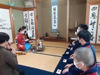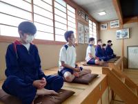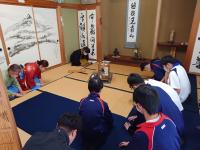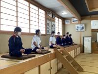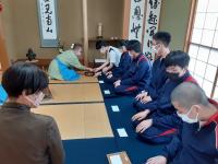 座禅体験では、「座禅をしながら何も考えないというのは難しい」「体験できてよかった」と話していました。煎茶体験では、お茶室への出入りの仕方、お茶を頂くときの作法、お部屋に飾られた掛け軸や生けたお花の意味について副住職からお話を聴きながら、緊張した面持ちでお茶を頂いていました。