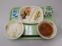 今日はトマトミートオムレツ、ねりこみ、芋餅汁です。