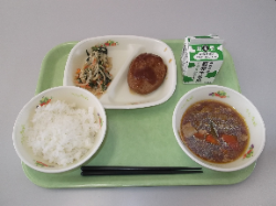 今日はハンバーグ、モヤシのゴマ和え、春雨スープです。