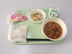 今日は肉団子、キャベツの海苔和え、サツマイモ汁です。リンゴジュース付き