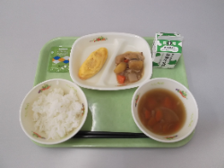 今日はトマトミートオムレツ、ねりこみ、芋餅汁です。