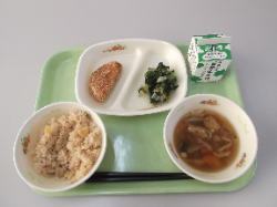 今日は栗ご飯、ハムカツ、白菜のなめ茸和え、白玉汁です。
