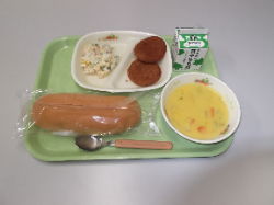今日は背割りコッペパン、ハムカツ、コールスローサラダ、パンプキンシチューです。