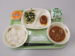 今日はデミグラスハンバーグ、白菜の海苔和え、味噌けんちん汁です。