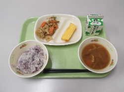 今日はゆかりご飯、玉子焼き、レンコンの味噌マヨ炒め、味噌けんちん汁です。