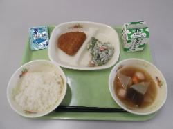 今日はカボチャと挽肉のフライ、ひじきとクワイのサラダ、おでんです。